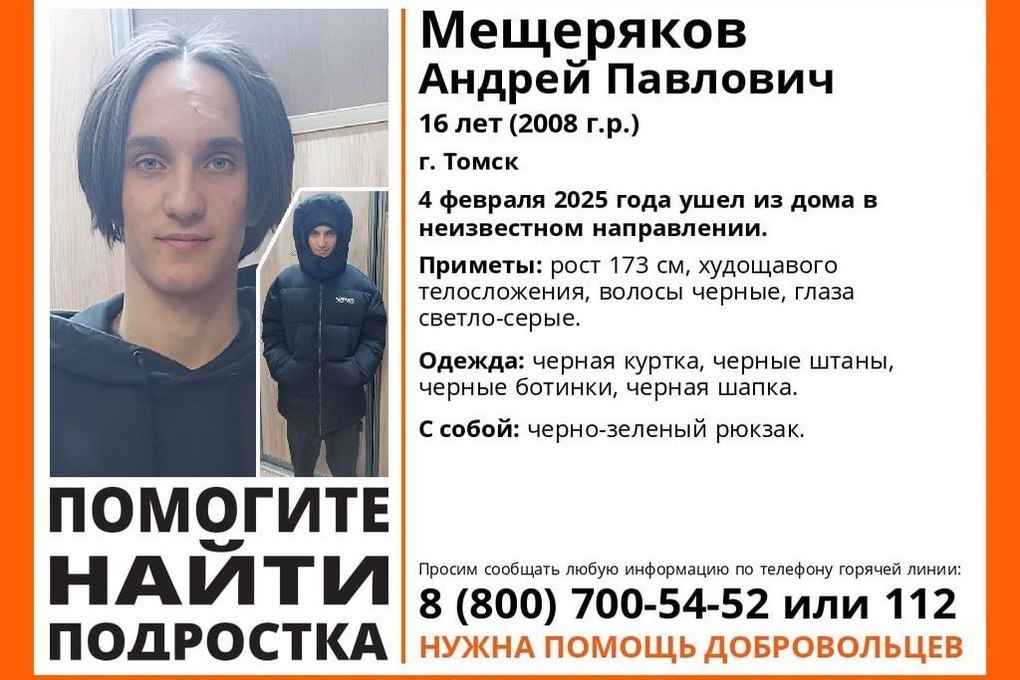 "г. #Томск, внимание! Помогите найти подростка! Пропал #Мещеряков Андрей Павлович, 16 лет (2008 г.р.).4 февраля 2025 года ушел из дома в неизвестном направлении", - говорится в сообщении поисковиков.