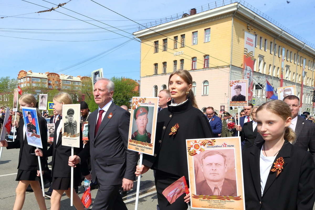 Семья губернатора пронесла портреты своих родных – участников Великой Отечественной войны Сосипатра Алемжина и Сергея Приезжева, а также труженицы тыла Ольги Матвеевой и участника СВО Андрея Подвигина, погибшего при выполнении боевого задания и посмертно награжденного орденом Мужества.